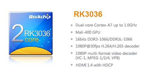 Rockchip RK3036芯片采用雙核Cortex-A7架構,主頻最高可達1.0GHz;支持1080P H.265/H.264/VC-1/MPEG/VP8Video Decoder;兼容多種協(xié)議的流媒體格式;支持多種投屏互動協(xié)議,如DLNA、Miracast、WiDi等互聯(lián)互通協(xié)議;