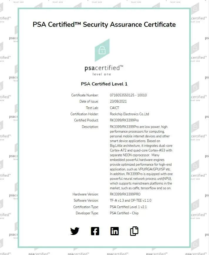 此前,RK3399Pro和RK3399已通過由Arm倡議發(fā)起、專為物聯(lián)網(wǎng)設備構建的安全框架PSA Certified Level 1安全認證,支持基于PSA Certified框架的IoT物聯(lián)網(wǎng)及邊緣計算解決方案高效部署,提升設備的數(shù)據(jù)安全性及可靠性。