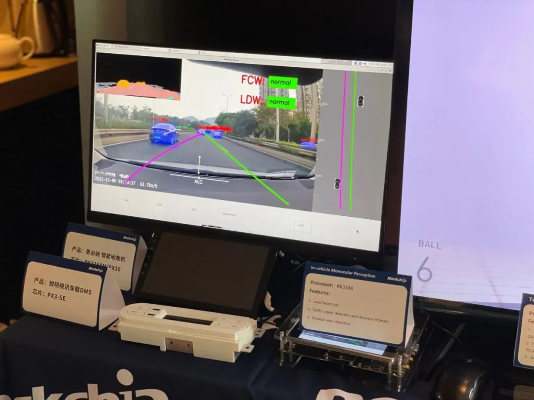 汽車(chē)電子展區(qū),展出各類(lèi)搭載瑞芯微方案的車(chē)載產(chǎn)品,涵蓋乘用車(chē)方案、商用車(chē)方案及智能座艙方案,現(xiàn)場(chǎng)演示了搭載RK3588芯ADAS汽車(chē)視覺(jué)算法,可識(shí)別汽車(chē)在駐車(chē)行進(jìn)中的車(chē)距路距及物體識(shí)別,以實(shí)現(xiàn)避障及360度環(huán)視功能,還展示了搭載RK3358M的中控屏等應(yīng)用。