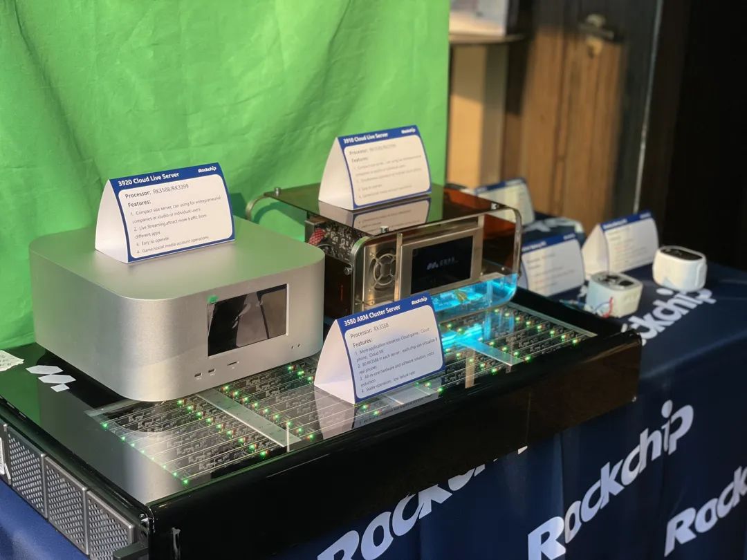 在行業(yè)應(yīng)用展區(qū),瑞芯微展示了RK3588的邊緣計(jì)算設(shè)備,集成了80個(gè)RK3588,支持虛擬出8個(gè)真實(shí)電話,支持在云游戲、云手機(jī)、云XR等場(chǎng)景應(yīng)用;還展出了多屏異顯直播設(shè)備,支持多平臺(tái)同時(shí)開(kāi)播,支持各類(lèi)專(zhuān)業(yè)直播場(chǎng)景;本展區(qū)展示的系列終端覆蓋工業(yè)、電力、教育、醫(yī)療、金融等各個(gè)領(lǐng)域,如:電力集中器、工業(yè)平板、醫(yī)療平板、銀行面板機(jī)等。